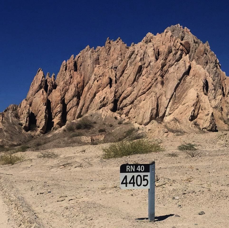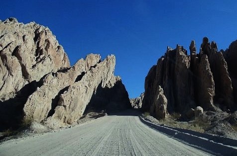 Gigantes puntas de flechas pétreas inclinadas, apuntando al cielo infinitamente azul. Sol, viento, silencio y susurros misteriosos. Entre Cachi y Cafayate.