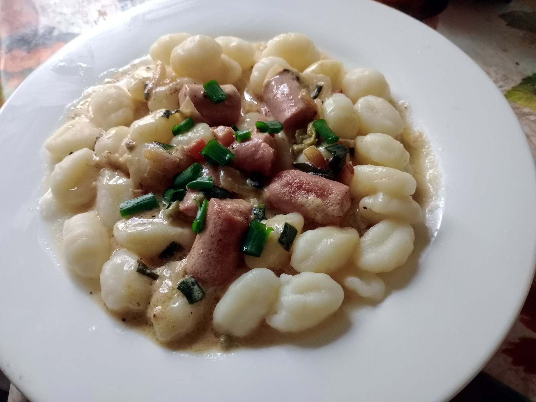 Tras escurrir la pasta, en un plato playo colocá dos cucharones de ñoquis y uno de salsa de crema y verdeo. Cada quien pondrá algún billete debajo de cada plato.