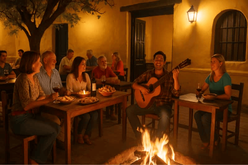 “En un patio de casona antigua nos sentamos mientras en otras había chicos, tocando la guitarra y cantando folklore. En el medio ardían unos troncos. Esa música no era de mi gusto, pero al rato estaba encantada con el alegre y cordial ambiente”