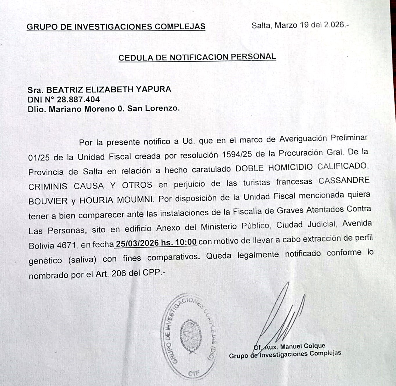 El Ministerio Público Fiscal de Salta informó, a mediados de marzo de este año, la recuperación de los remantes de las muestras biológicas de Cassandre y Houria. Luego, fue la citación a Beatriz Yapura.