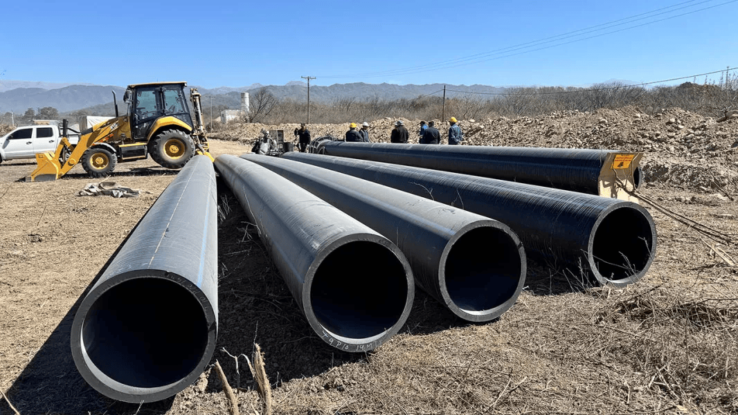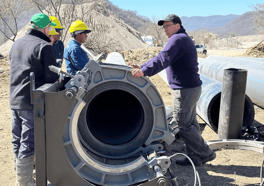 Personal de la empresa de servicio de agua se encuentra realizando la preparación y empalme de la nueva cañería a través de trabajos de termofusión para luego proceder a la colocación en la nueva traza y conexión al sistema.
